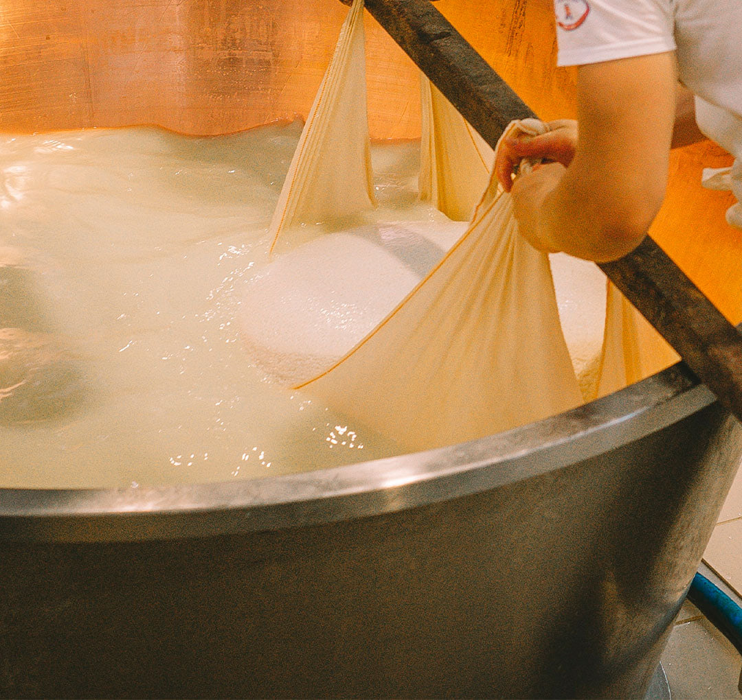 Il latte del mattino e della sera precedente vengono versati nelle tipiche caldaie di rame. La coagulazione del latte, prodotta grazie all’aggiunta di caglio e siero, forma la cagliata, che successivamente viene frammentata in granuli.